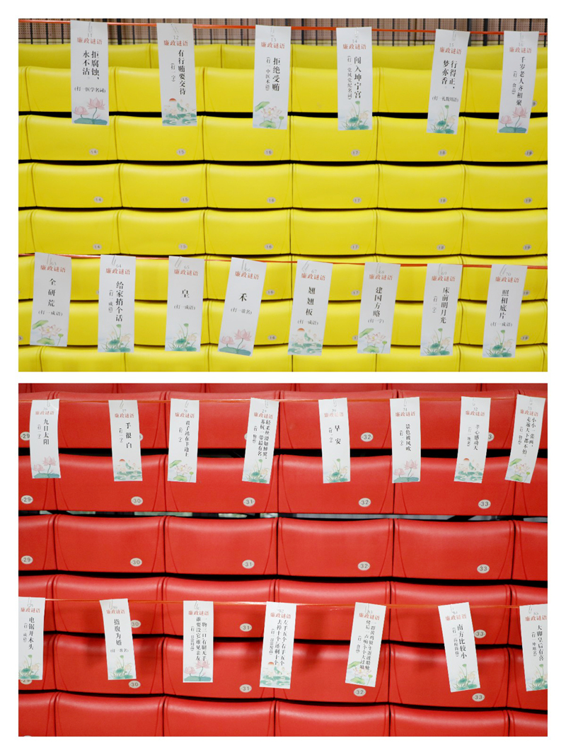 “掀起反腐熱潮(打一衛(wèi)生防疫用語(yǔ))”“拒腐蝕,永不沾(打一醫(yī)學(xué)名詞)”“拒絕受賄(打一中醫(yī)術(shù)語(yǔ))”“闖入坤寧宮(打一黨風(fēng)黨紀(jì)名詞)”……猜謎現(xiàn)場(chǎng)共設(shè)有100條謎題,主要包括黨規(guī)法紀(jì)、反腐倡廉、作風(fēng)建設(shè)工作等關(guān)鍵詞,結(jié)合成語(yǔ)、俗語(yǔ)、日常用品等多種類型題目,內(nèi)容豐富、趣味盎然,既具知識(shí)性,又具娛樂(lè)性。公司員工們饒有興致地聚集在一條條謎語(yǔ)前,或單槍匹馬冥思苦想,或集思廣益共揭謎底,或咬文嚼字熱烈討論,現(xiàn)場(chǎng)氛圍濃厚,歡聲笑語(yǔ)不斷。
